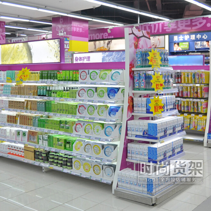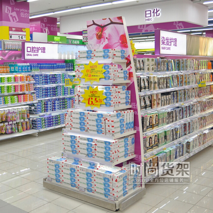 【產品名稱】超市日用品貨架/雙面日用品展示架/鋼制日化區貨架